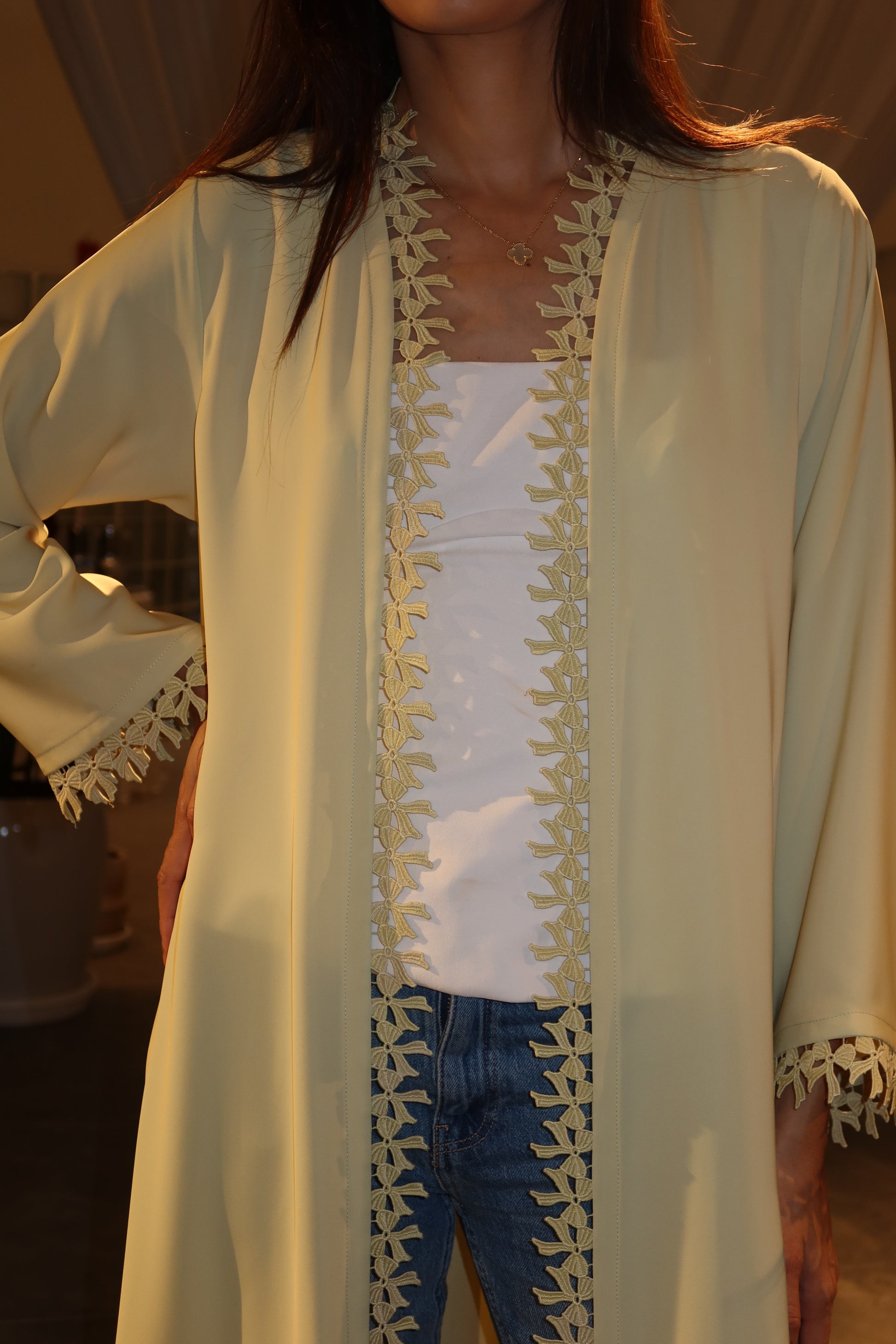 ⟡This sophisticated abaya features delicate bow-patterned lace along the edges and sleeves, adding a touch of elegance to its flowing silhouette, drapes beautifully for a graceful look. The open-front design makes it versatile for layering over any outfit, perfect for both casual and formal occasions.