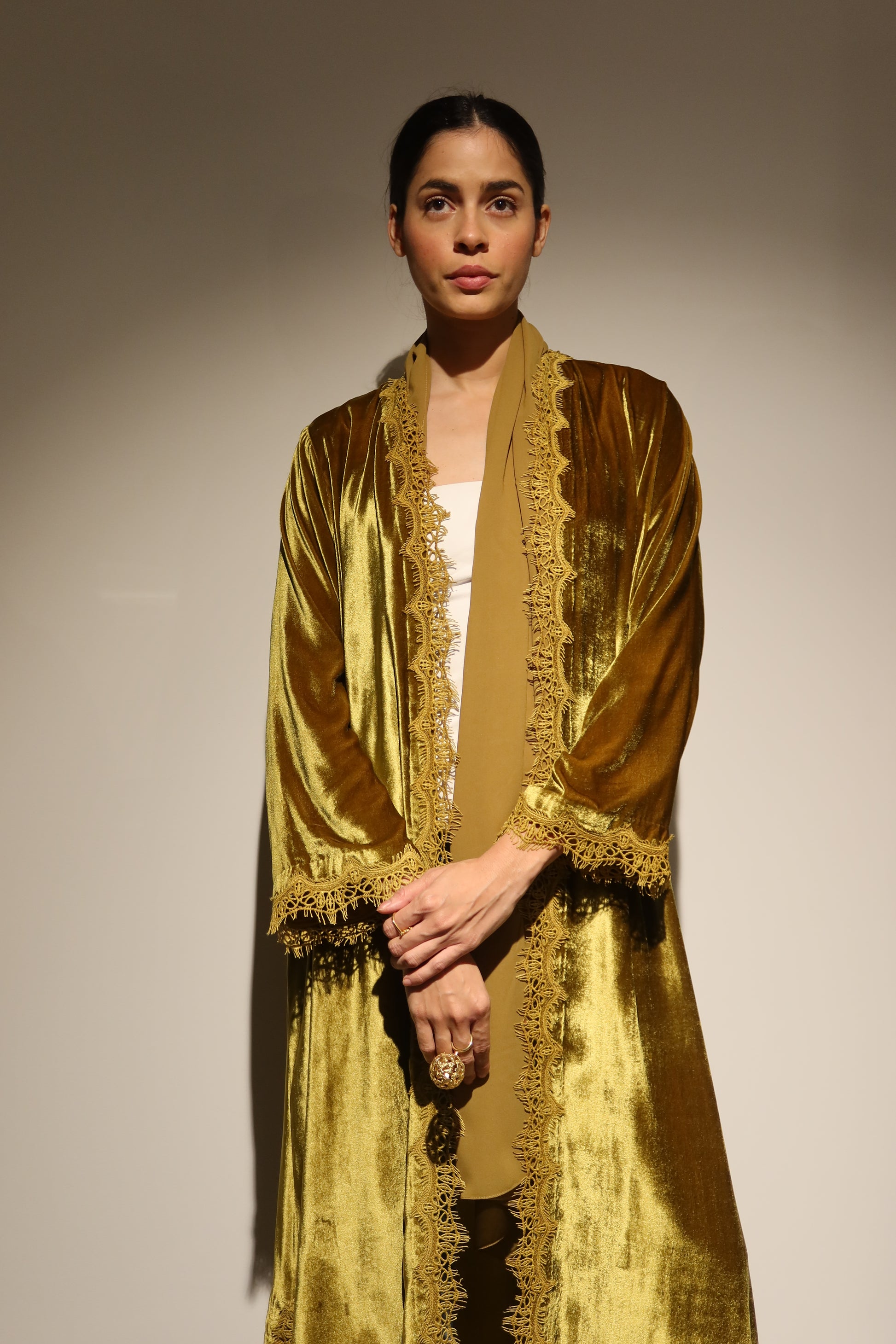 Celeste designed with a fluid, elegant drape and subtle side slits for ease of movement. Finished with delicate lace detailing along the front and sleeves, it offers a balance of femininity and understated sophistication, perfect for effortless layering.