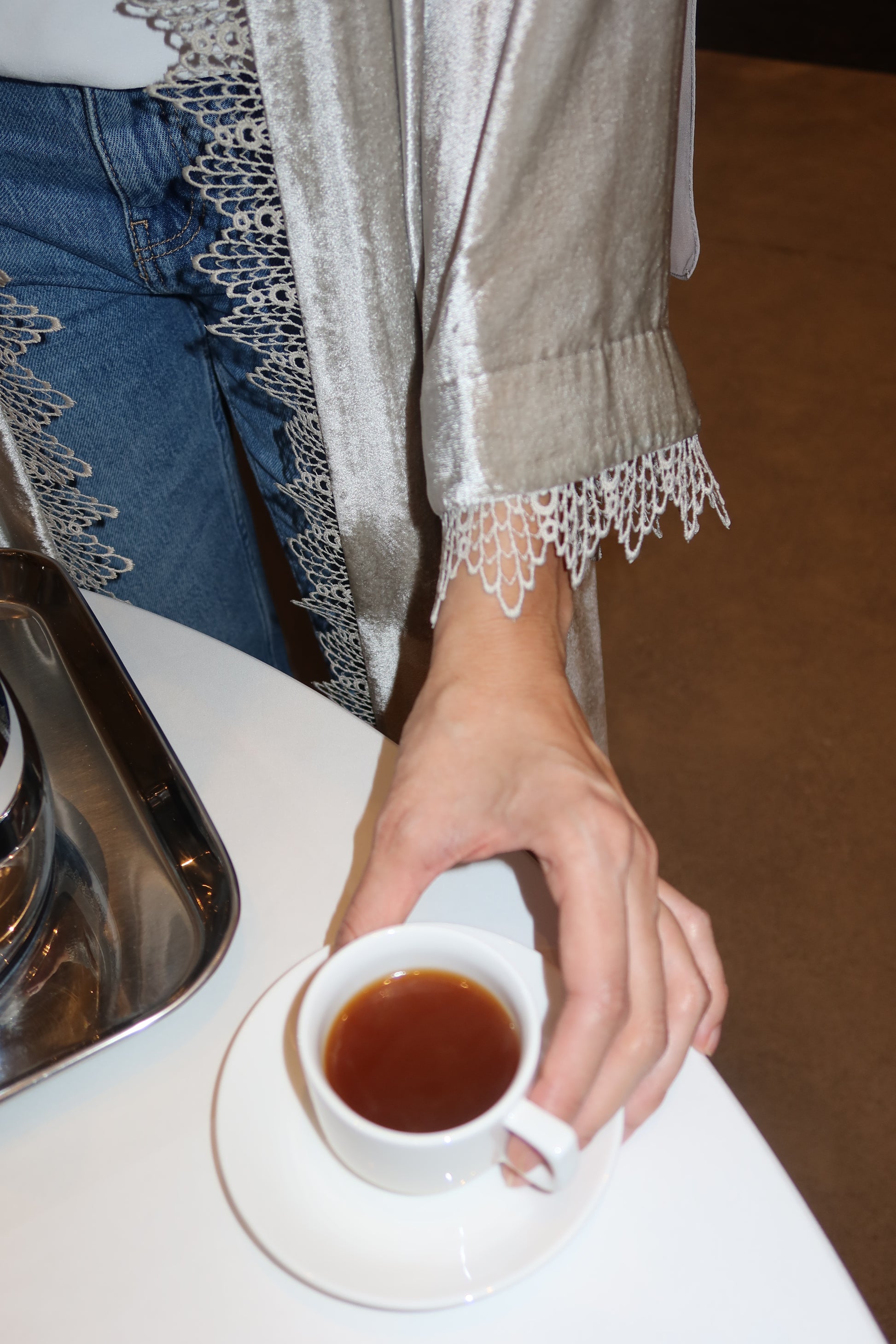 Threaded designed with a fluid drape and subtle side slits for ease of movement. Finished with delicate lace trimmings along the front and sleeves, it offers effortless elegance and versatile layering.